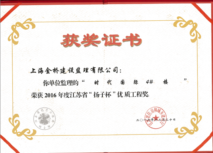时代国际4#楼”荣获2016年度江苏省“扬子杯”优质工程奖